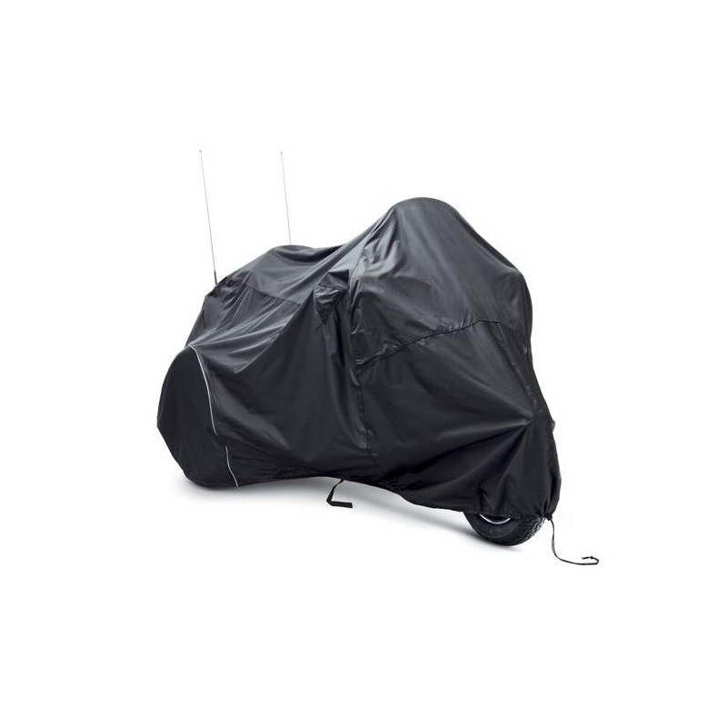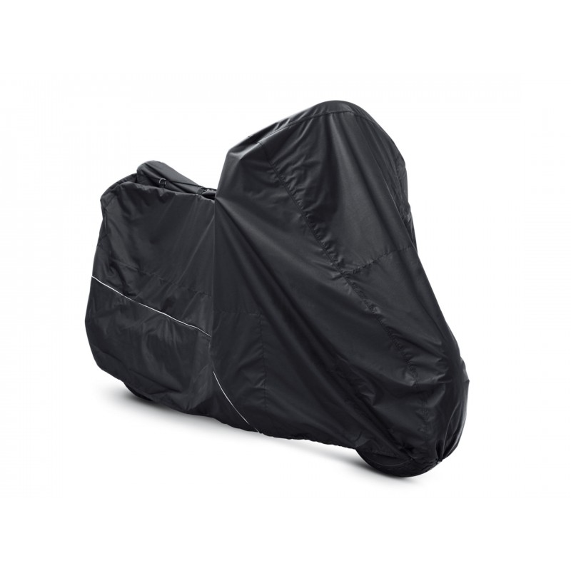 Esta funda de altas prestaciones está fabricada con poliéster Denier 300 resistente al desgaste con patron de diamante e incluye juntas cubiertas para mejorar la impermeabilidad. Los respiraderos protegidos de la intemperie en la parte superior de la funda favorecen la circulación del aire y reducen la acumulación de humedad., al tiempo que minimizan la corrosión durante los periodos de almacenaje cortos o largos. Los paneles termoresistentes internos protegen la funda del tubo de escape caliente y una bolsa integrada permite guardarla cómodamente cuando no se utiliza.