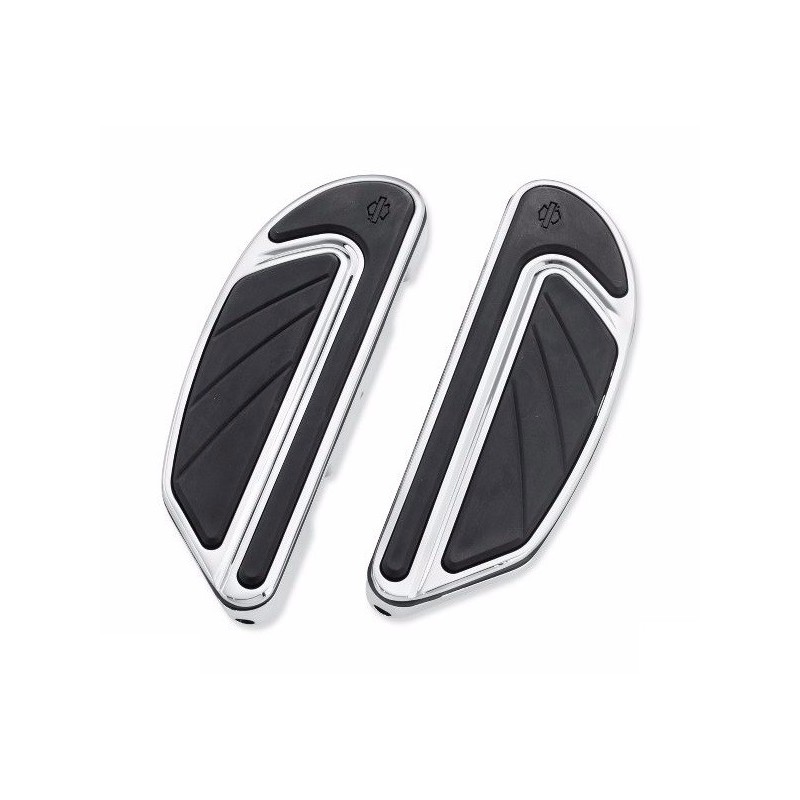 Comfortable and stylish, these fighter-wing shaped footboards add an elegant finish to your ride. The complete kit includes chrome delta wing-shaped footboard pans with vibration-isolated inserts for a fatigue-free ride. The black rubber pads feature a deep embossed Bar & Shield logo and rear-sweeping traction grooves.
