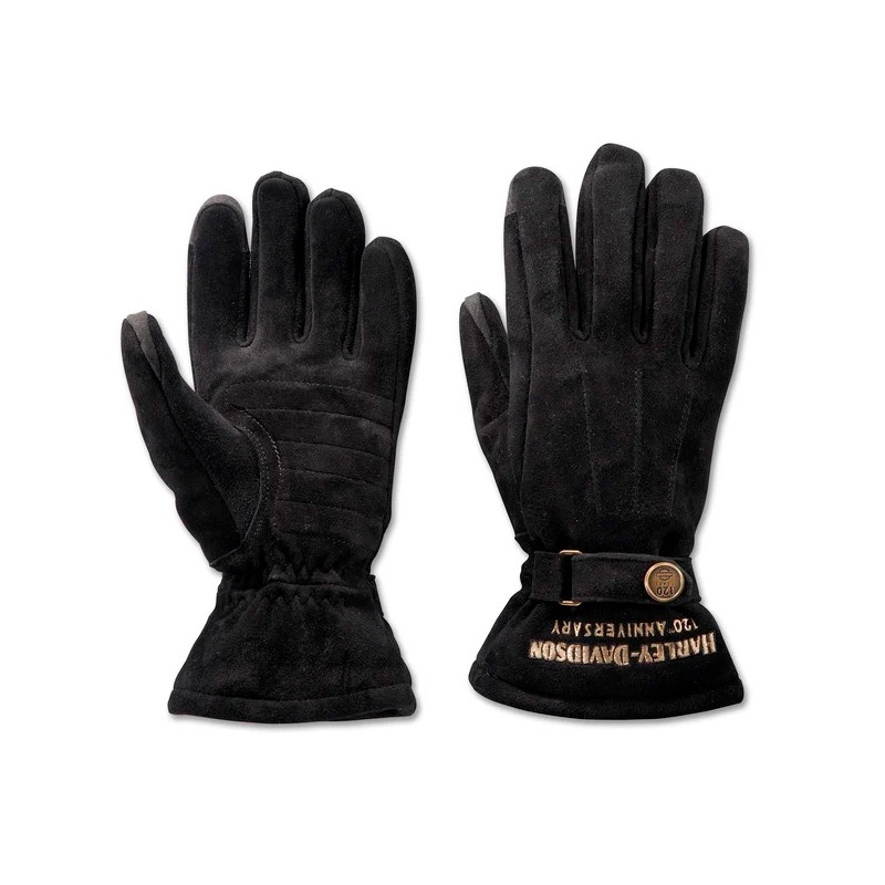 Warmth, protection, and our storied history all converge on the 120th Anniversary Wistful Leather Gloves. Crafted from suede with an insulated lining to keep the chill out, they feature pre-curved fingers and a snap-closed wrist. These versatile, gauntlet style riding gloves can be worn over or under the cuff. They’re also touch-screen compatible with a padded palm to keep your grip more comfortable. The vintage-inspired style is finished with our custom 120th Anniversary branding and hardware for a commemorative Harley-Davidson look.