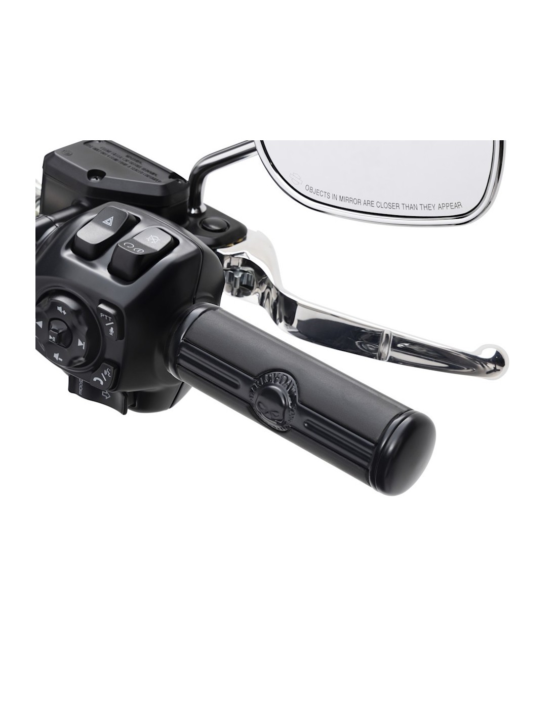 Darken your motorcycle’s profile with the Willie G Skull Collection Grips in Black. These grips (Part Number: 56100752) feature the brooding Willie G Skull logo encircled by the Harley-Davidson script, delivering a high-contrast look that fits the Dark Custom aesthetic perfectly. Beyond the style, the raised rubber pads provide a positive, non-slip grip and added cushioning to keep you comfortable on those high-mileage days.