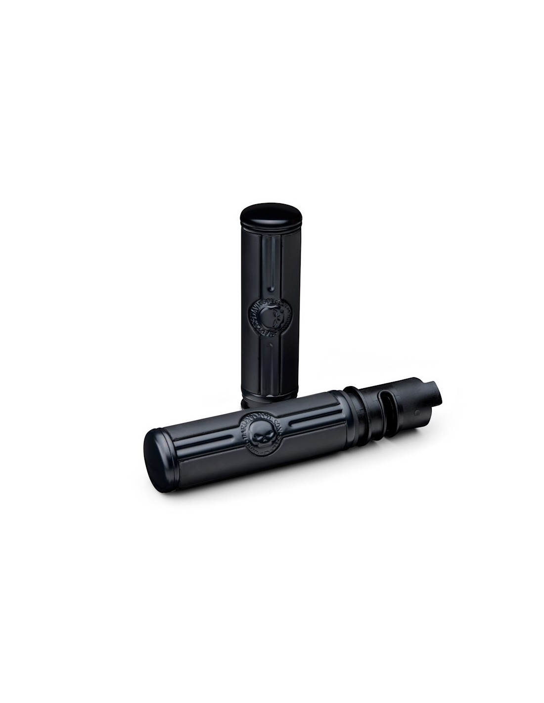 Willie G Skull Collection Grips (Ref: 56100752) in black finish. Featuring raised rubber pads for a 38mm comfortable grip and a glue-less installation system.