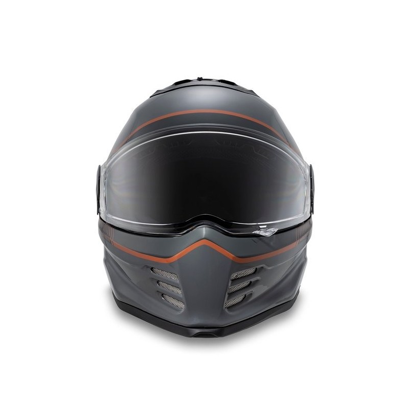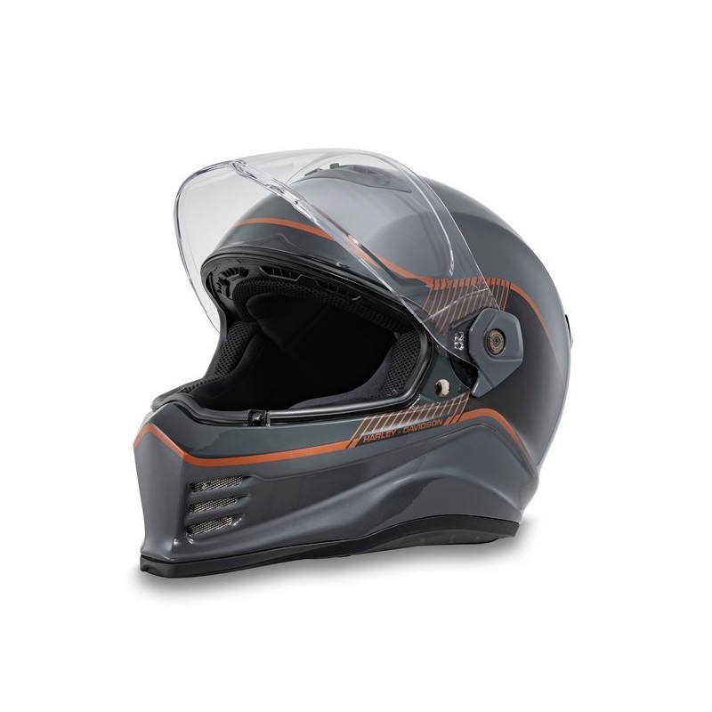Aerodynamically improved, securely sealed, and fog-free…those are a few reasons why our Limited Edition Division X15 Sunshield Full Face Helmet is a new maximum coverage favorite. Its low-profile shell is engineered to minimize both lift and turbulence for a smoother, quieter, and more stable ride. Add to that a convenient toolless face shield system, a ratchet system that pulls the face shield securely against the eyeport, and a clearer view from advanced fog-free technology. Finished with a hit of our iconic orange color for an authentic Harley-Davidson look. Learn more in the specs below, then cart this helmet style soon since it’s only here until supplies last.