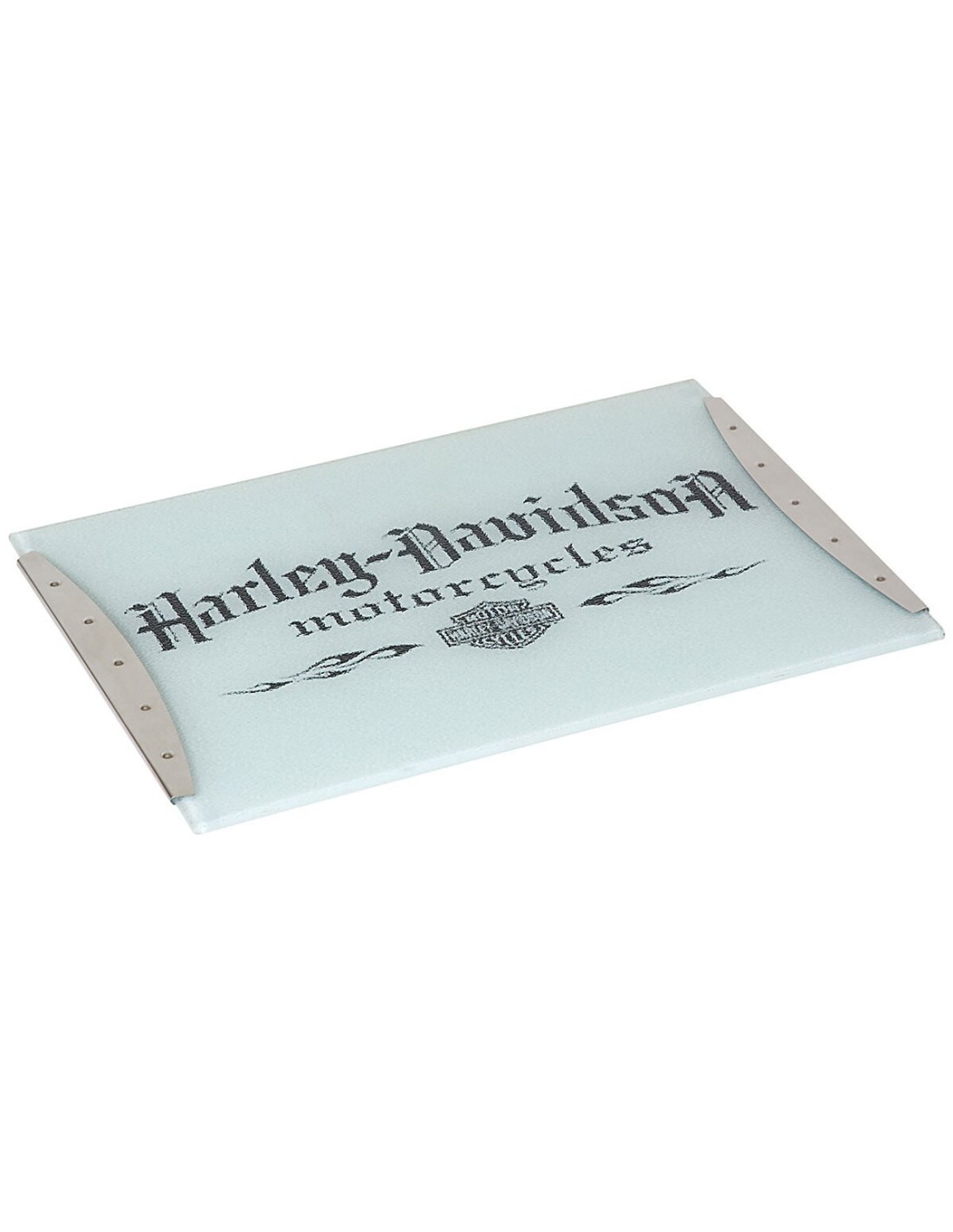 Bring the spirit of the open road into your kitchen with this Harley-Davidson® cutting board, designed with an H-D motorcycle graphic and stylish brushed aluminum handles. Its tempered glass surface is highly scratch and break resistant, ideal for worry-free everyday use.