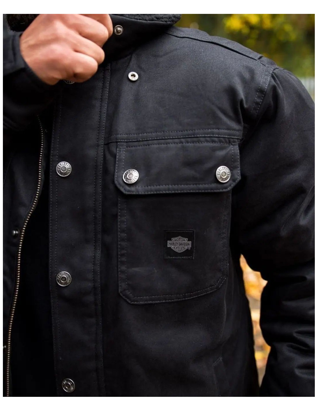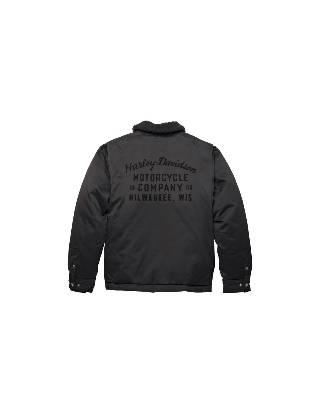 Stay cozy and committed to the legendary motorcycle brand you love in our Milwaukee Twill Jacket. Made from rugged cotton twill that’s enzyme washed for softness and a well-worn look, with a quilted lining for extra warmth. Available in a traditional and slim fit custom silhouette with ride-friendly features like an action back and hidden snap-down collar that won’t flap around while you ride. Its polyester Sherpa collar adds a hit of fuzzy comfort, while the back celebrates the Harley-Davidson origin story in bold embroidery.