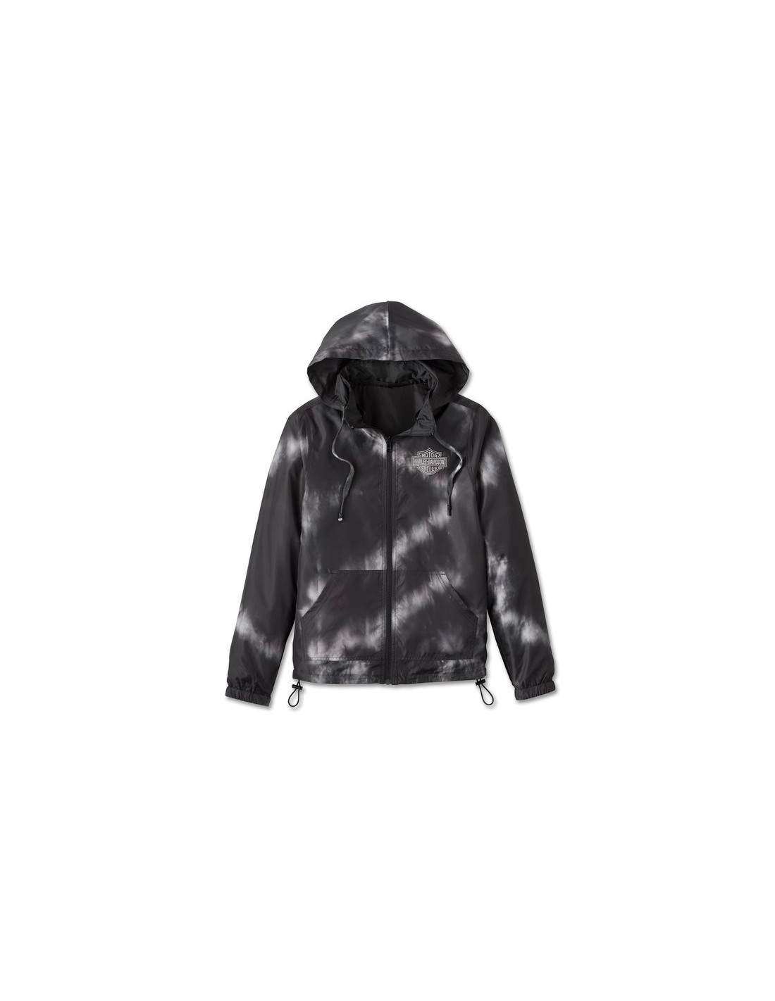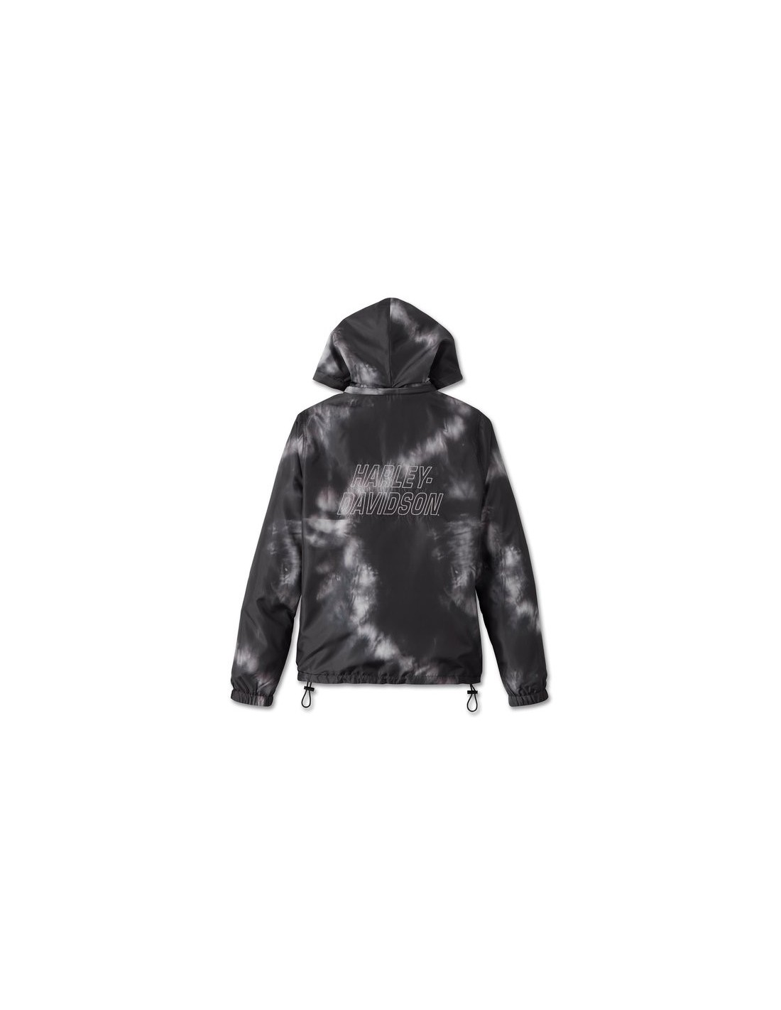 Made from lightweight nylon taffeta, this jacket offers comfort and adaptability. Wear it plain for a low-key look or flip it over for a bold tie-dye print. It features an adjustable drawstring waist, a detachable hood with rubberized drawcords for comfort under a helmet, and an exposed front zipper.