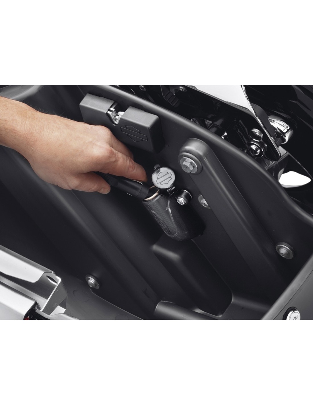 Este cómodo puerto de alimentación se instala en la pared interior de la alforja, lo que te permite cargar teléfonos móviles y reproductores de música mientras viajas. El puerto de alimentación cuenta con conector de desconexión rápida para uso con alforjas desmontables.