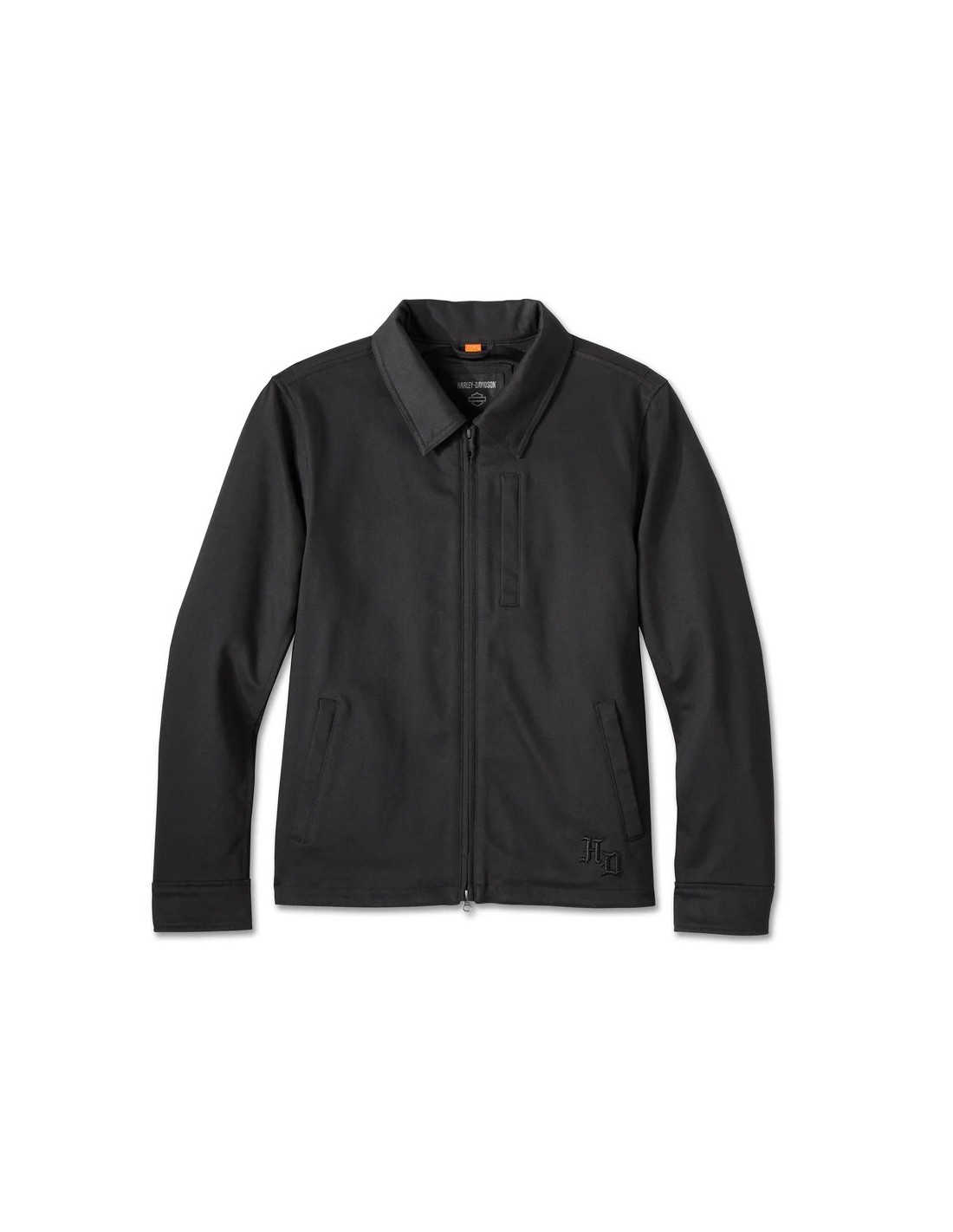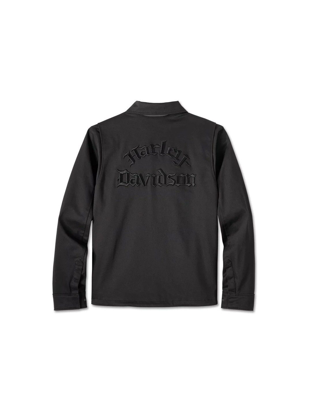 La chaqueta se remata con un bordado en relieve tonal que añade dimensión, asegurando un estilo Harley-Davidson atemporal.