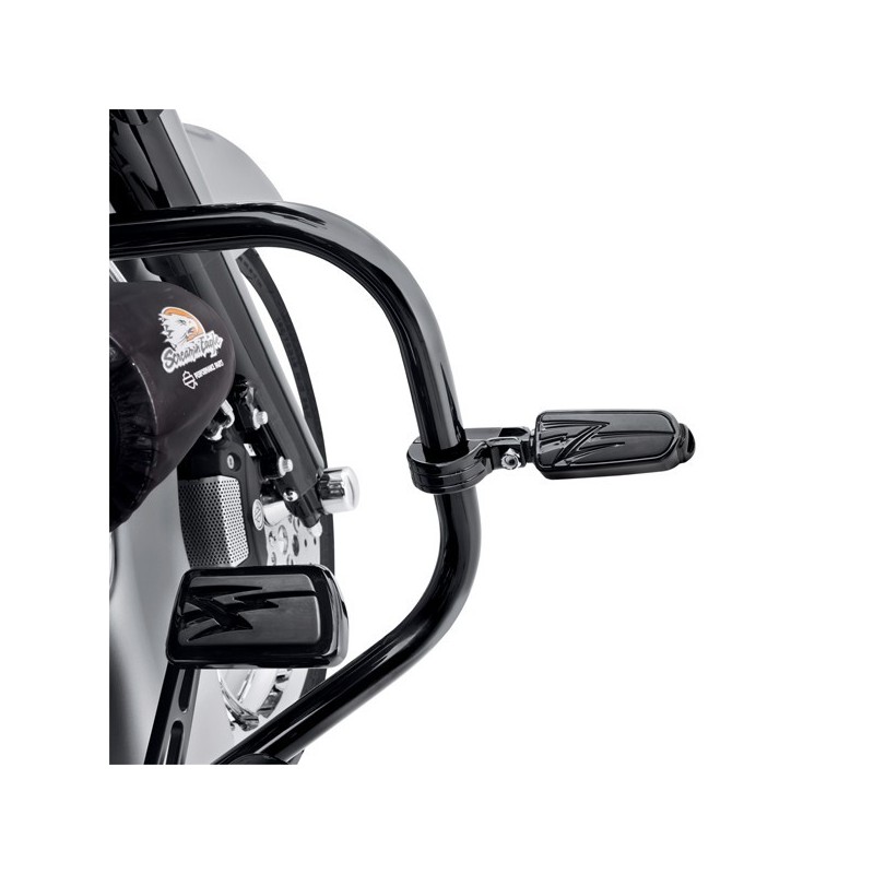 Aqui tienes una forma elegante de llevar los pies al viento. Este kit de fijacion de estriberas de aluminio estilo billet bellamente pulido se instala facilmente en la proteccion del motor y te permite estirar las piernas durante viajes largos. Disponibles en acabado negro brillante o cromado. Funciona con todas las estriberas estilo H-D de montaje macho.