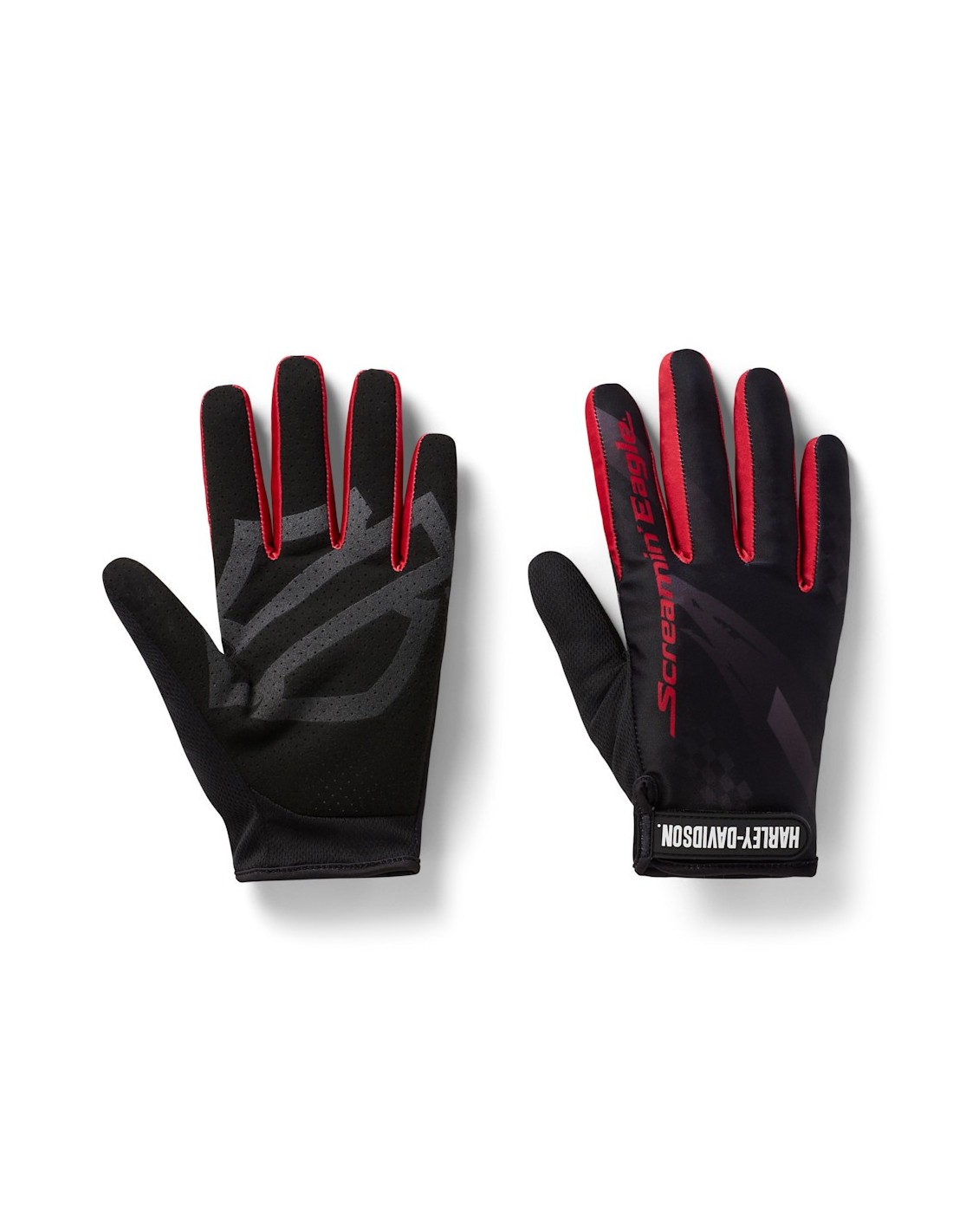 La palma de piel sintética garantiza un agarre firme y duradero, mientras que la muñequera de goma con cierre de Velcro® facilita el quita y pon y asegura un ajuste preciso. No tendrás que desconectarte, ya que son totalmente compatibles con pantallas táctiles. Su diseño destaca por el icónico color Hot Rod Red y una combinación de estampados suaves y de alta densidad que hacen que los gráficos Screamin' Eagle cobren vida.
