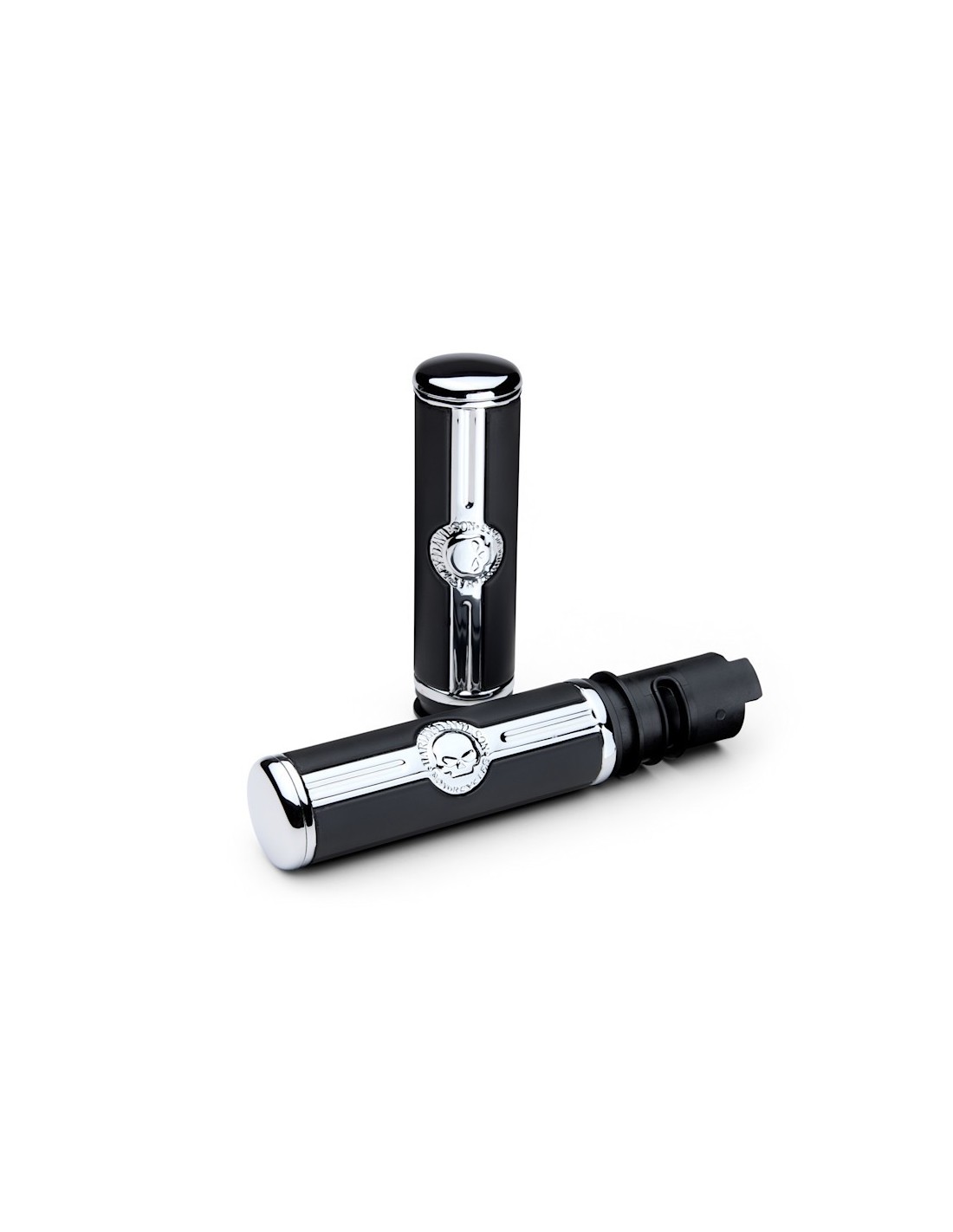 Puños de la Willie G Skull Collection (Ref: 56100750). Combinación de cromo pulido y goma de alto agarre con el legendario logotipo de la calavera. Diseño sin pegamento para un mantenimiento sencillo